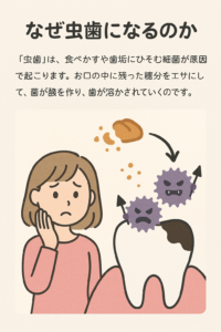 つまり、むし歯は「細菌・糖分・歯の質・時間」といった要素が重なり合うことで起こると考えられており、日々のケアと環境づくりがとても重要になります。