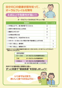 オーラルは「口腔」、フレイルは「虚弱」を意味します。噛んだり、飲み込んだり、話したりするための口腔機能が衰えることを指し、心身機能の低下に大きくつながってきます。